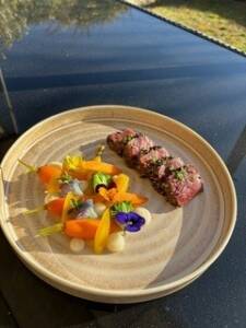 6.Dressez votre assiette et ajoutez un peu de sel pyramidal sur la viande et les légumes.