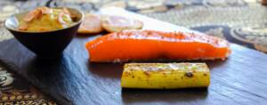 6. Après un temps de cuisson de 20 à 30mn (tout dépend de votre four et du diamètre des poireaux), placez-les dans un plat avec le demi jus d’une orange pressée, un trait d’huile d’olive, un trait de sauce soja, une pluie de phu quoc blanc et de fleur de sel « Best of Salt ».